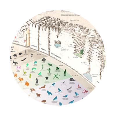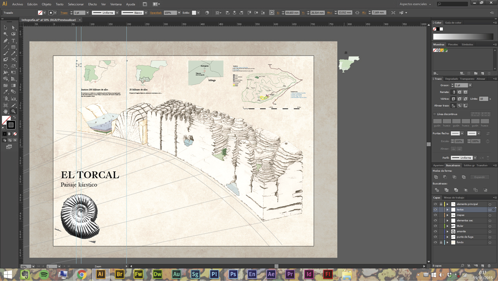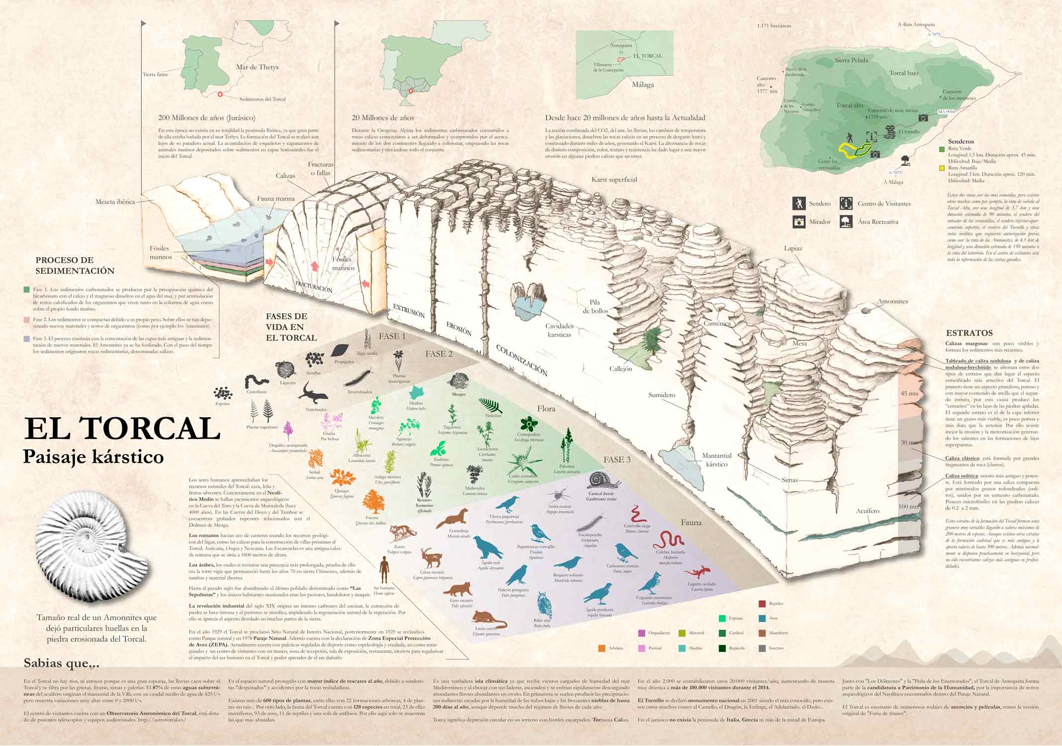 Saber interpretar y recopilar información para generar unas composiciones en las que de tan solo un golpe de vista nos atraiga y a la misma vez nos enganche, además de ofrecernos toda la información necesaria, es un trabajo que puedes apreciar en este proyecto del Torcal de Antequera. Esta infografía te enseña de una forma directa, para que, de un golpe de vista aprecies la ilustración del Torcal, y con ella, la evolución de este milenario parque kárstico. Y que, seguida y detenidamente, te deleites con sus detalles, y puedas observar el proceso de sedimentación, su flora y fauna, sus rutas, el paso del hombre por El Torcal, y muchísimas curiosidades más.